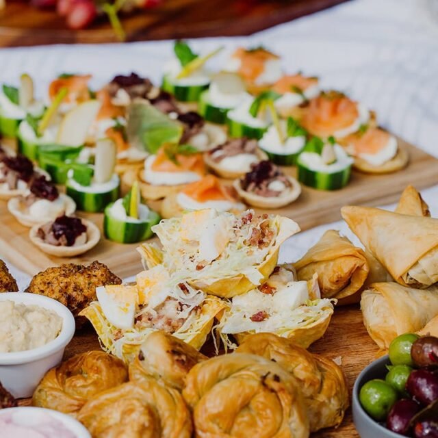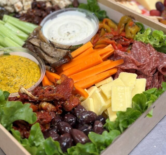 Beautifully presented, filled with marinated fetta, tasty cheese, cured and smoked meats, marinated green and black olives, dolmades, semi sundried tomatoes, roasted capsicum, grilled eggplant, celery and carrot sticks, dip and crackers.